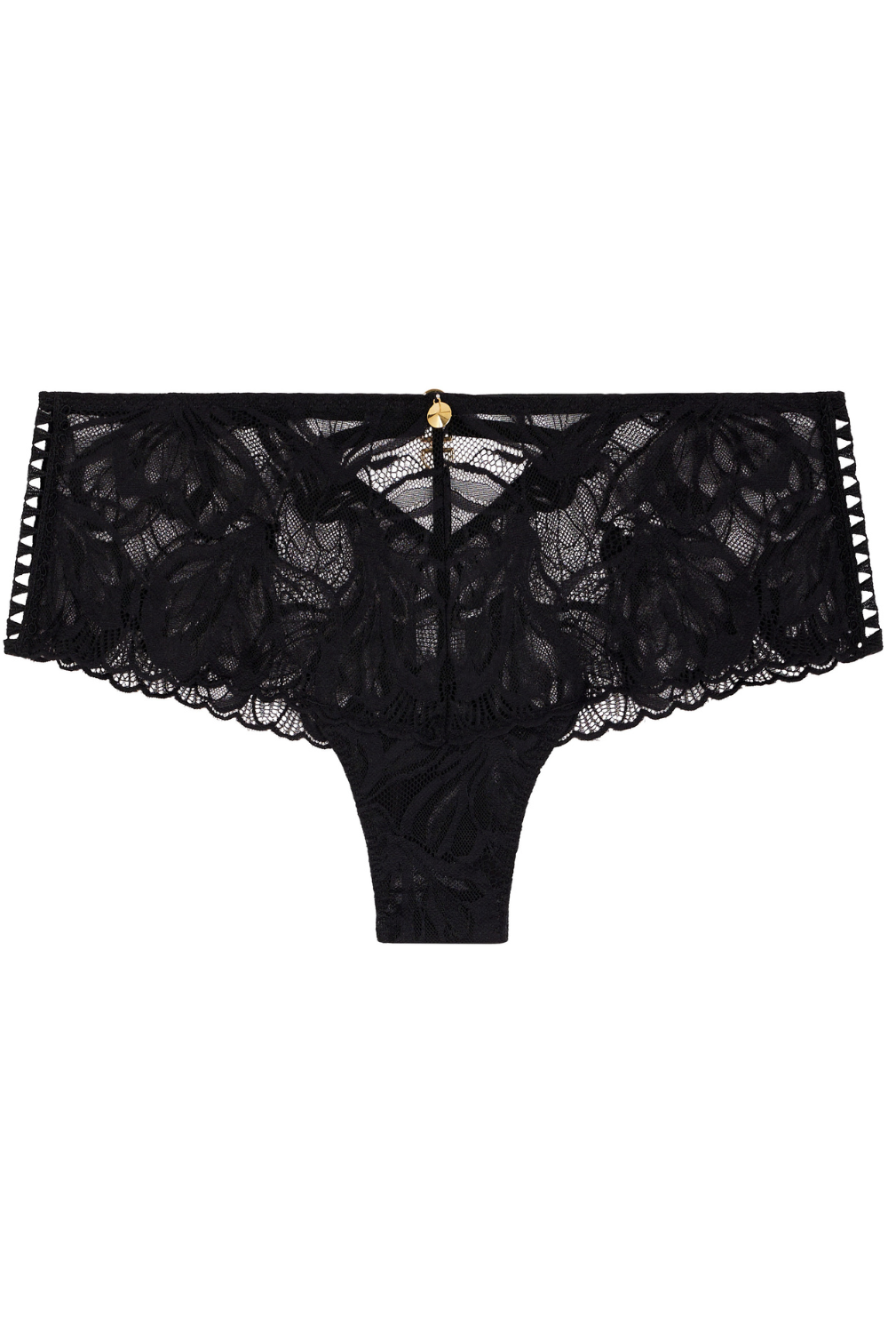 The Aubade After Hours Cheeky Brief blends elegance with comfort in a captivating black floral lace design. These French lace briefs provide soft, flattering coverage while revealing delicate glimpses of skin through open guipure lace panels at the hips. At the back, bondage-inspired straps and a seductive cut-out highlight the small of the back, creating a beautifully feminine silhouette. Pair them with the matching After Hours bra and suspender belt for a complete, luxurious Aubade lingerie ensemble.
