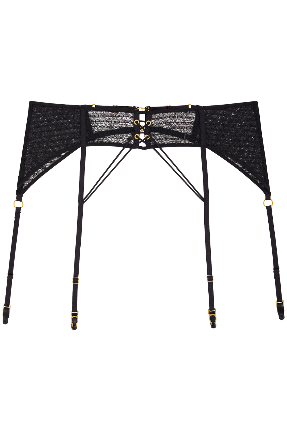 The Boîte à Désir Secret Language Suspender Belt combines striking black fabric with delicate lace-up corset details and subtle golden accents. Its adjustable straps ensure a perfect fit, while its bold design adds a refined touch of elegance to your lingerie ensemble. This piece is crafted to enhance your silhouette, offering both sophistication and allure.