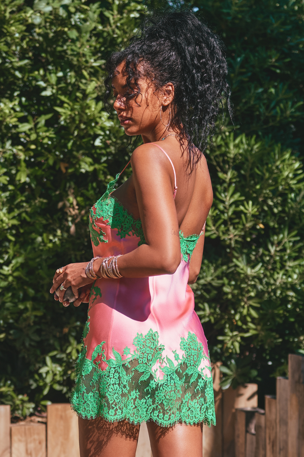 Embrace the captivating charm of the Apolline silk nightie, where sophistication blends with sensuality. Crafted from flowing pink silk satin that gently embraces the skin, it’s enhanced with delicate green lace detailing along the neckline, back, and hem, adding a subtle feminine elegance. This designer slip represents the pinnacle of luxury and allure.