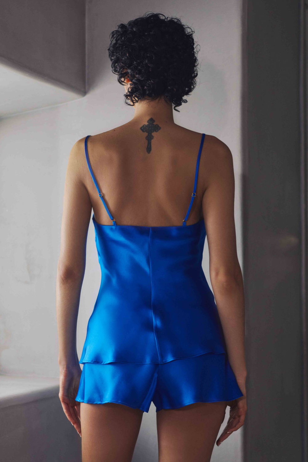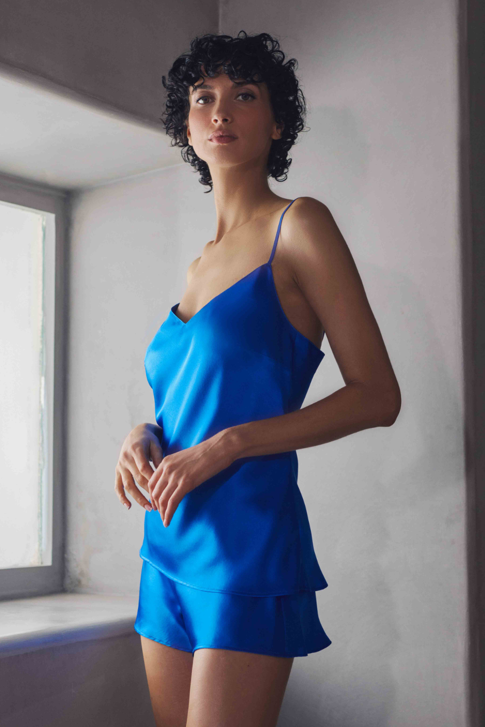 Marjolaine’s Betty Silk Night Shorts in celestial blue are fashioned from sumptuous 19 momme silk, offering a fluid shape. Designed with a short, comfortable fit and a sleek elastic waistband, they effortlessly complement matching silk sleepwear for elegant, relaxed wear during your leisure moments.