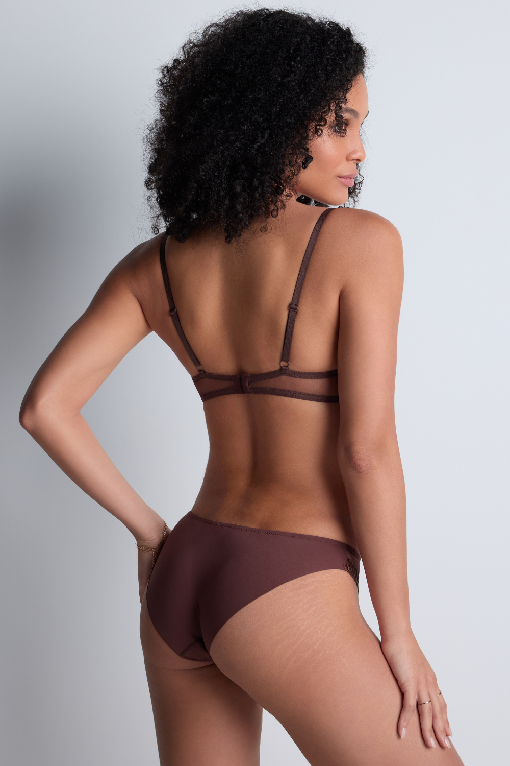 The Sheer Emotion Brown Brazilian Brief features sheer tulle and striking embroidery that gracefully embrace the hips, accented by a contemporary gold charm. Its soft, seamless back offers a smooth, invisible fit—combining luxury, elegance, and exceptional comfort. Pair it with the coordinating underwired bras or bralette to complete this exquisite lingerie collection.