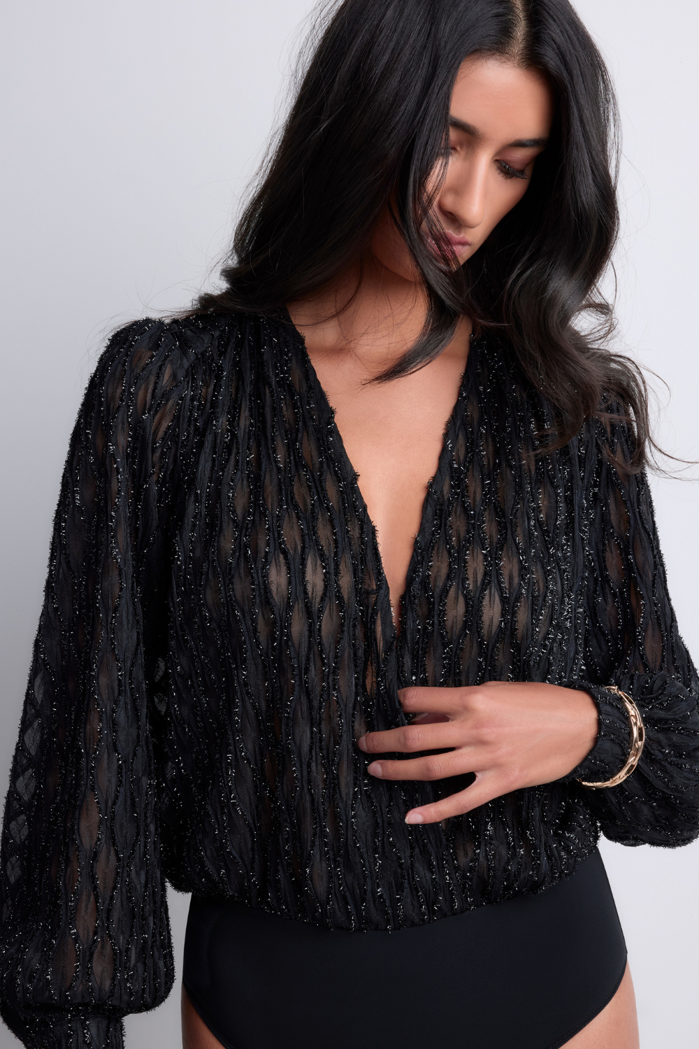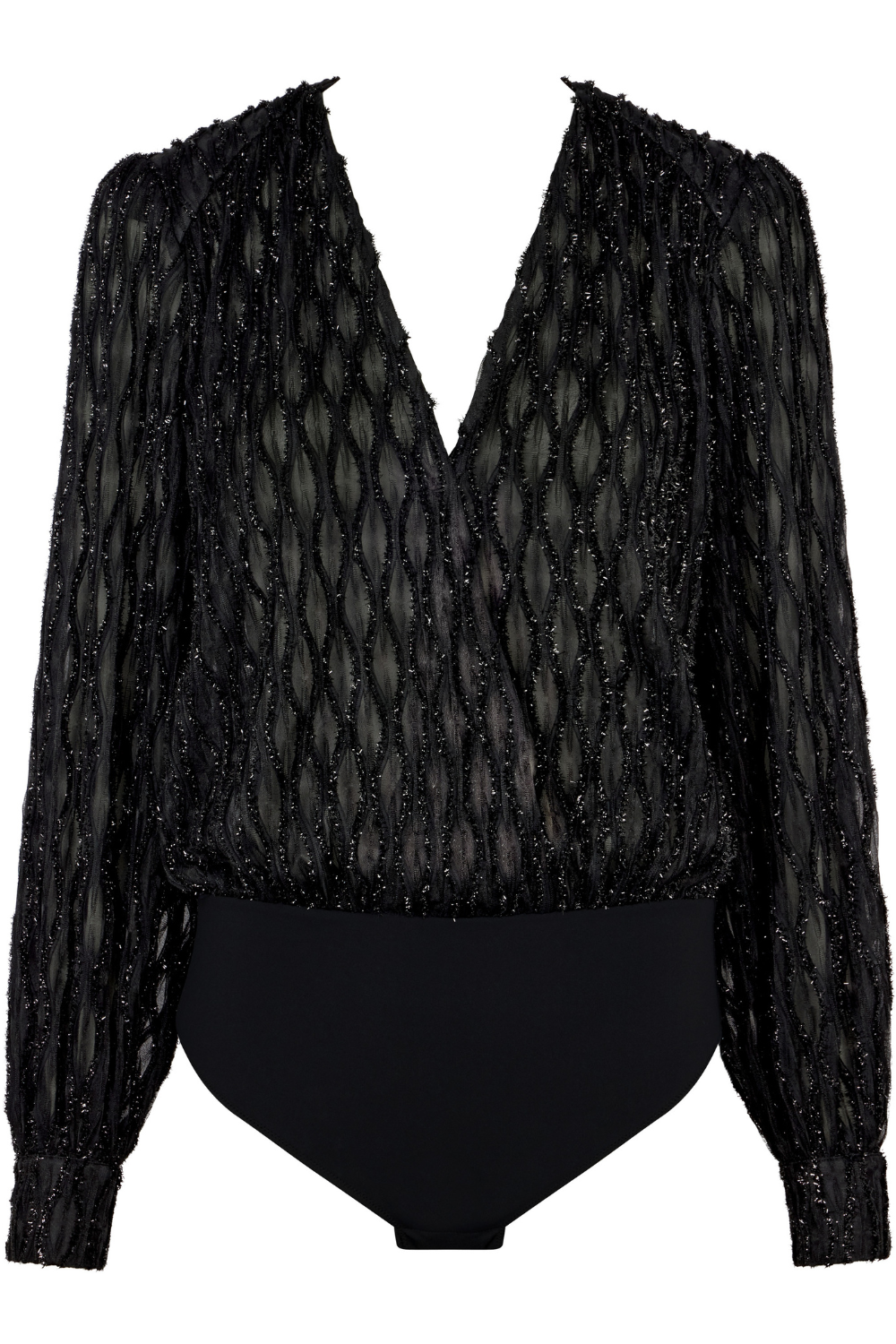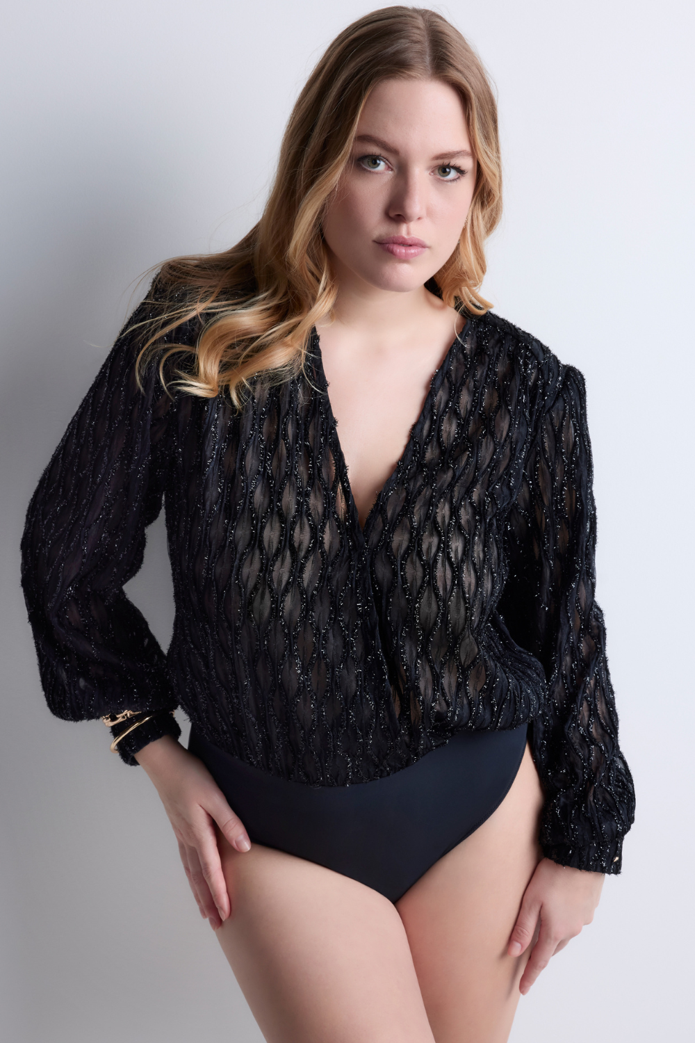 Elevate your bodysuit collection with this exquisite black body from French brand Aubade. Crafted in textured jacquard fabric woven with subtle metallic threads, it delivers a refined shimmer that catches the light gracefully. The elegant long sleeves end in cuffs adorned with golden buttons, while the flattering V-front neckline enhances your silhouette. A soft microfiber mesh brief and a breathable cotton gusset ensure comfort without compromising on its haute couture-inspired allure. This bodysuit effortlessly combines sophistication and sensuality for an impeccable, polished look.