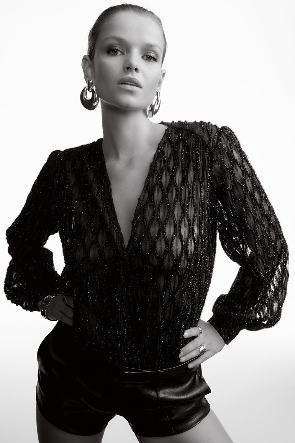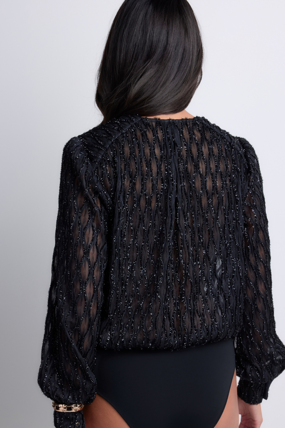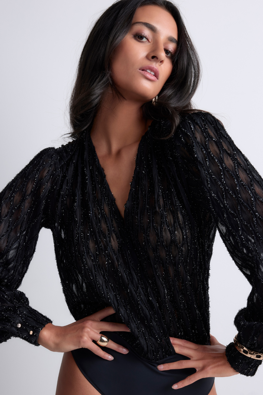 Elevate your bodysuit collection with this exquisite black body from French brand Aubade. Crafted in textured jacquard fabric woven with subtle metallic threads, it delivers a refined shimmer that catches the light gracefully. The elegant long sleeves end in cuffs adorned with golden buttons, while the flattering V-front neckline enhances your silhouette. A soft microfiber mesh brief and a breathable cotton gusset ensure comfort without compromising on its haute couture-inspired allure. This bodysuit effortlessly combines sophistication and sensuality for an impeccable, polished look.