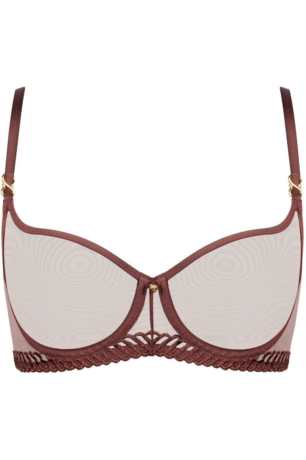 The Sheer Emotion Brown Half-Cup Bra captivates with striking graphic embroidery and delicate sheer mesh. Crafted from GRS-certified recycled fabrics, it includes an embroidered underband and elegant golden charm details—offering a luxurious fit that enhances your silhouette while supporting sustainable practices.
