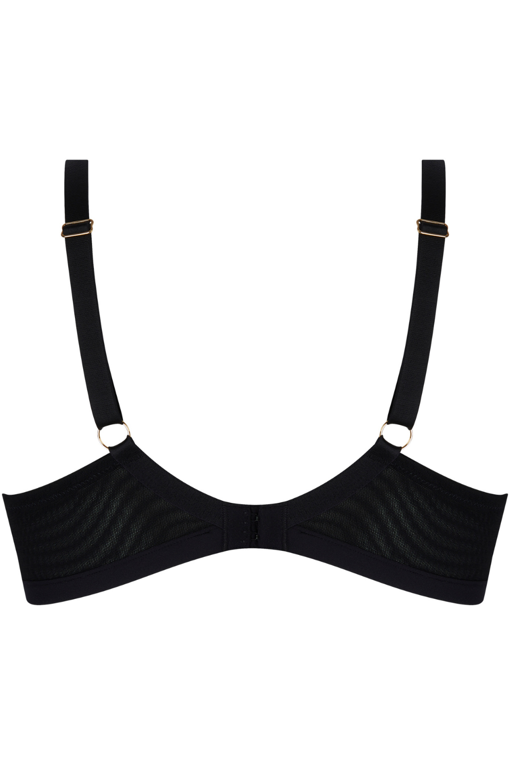Enhance your black lingerie selection with the Éclats d’Or Wired Triangle Bra by Lise Charmel. This elegant underwired bra showcases a gentle plunge neckline that flatters your figure. Its cups are embellished with intricate gold laminated scalloped embroidery and lined with delicate sheer tulle. The front straps feature a chic golden double-ring jewel, while a dazzling rhinestone detail at the cleavage highlights your natural allure.