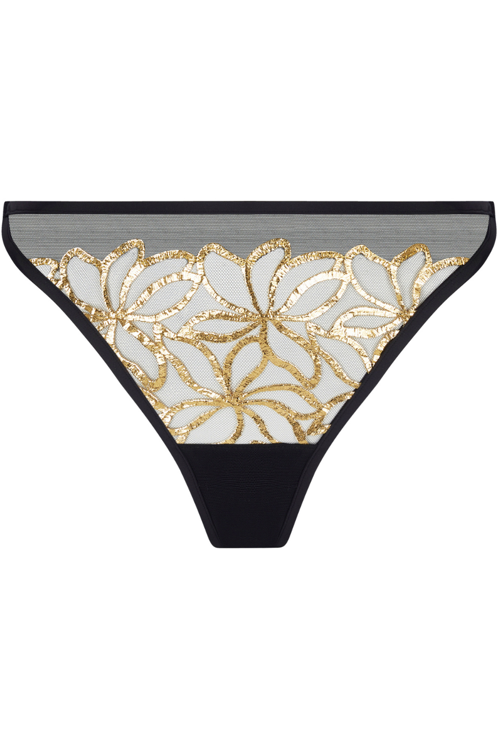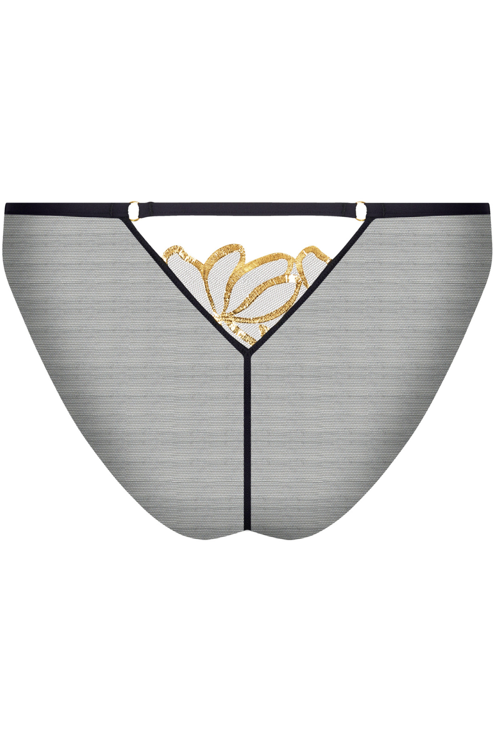 The Éclats d’Or Italian Brief from Lise Charmel combines black and gold for an exquisite look. It showcases delicate scalloped embroidery arranged in a triangle on both front and back, complemented by smooth, luxurious tulle. The soft mesh waistband and dual golden rings at the back enhance the brief's elegant and polished design.