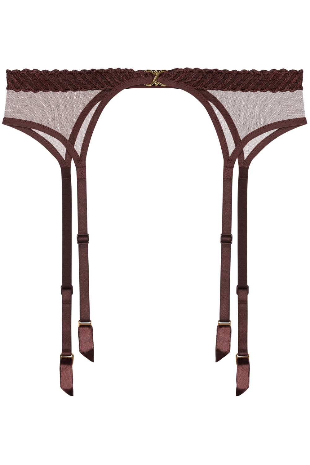 Experience refined allure with the Sheer Emotion Brown Suspender Belt. Its delicate sheer fabric exudes subtle confidence, complemented by bold embroidered trims and a shimmering golden charm for a standout finish.