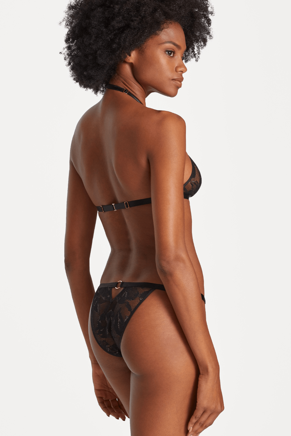 The alluring Nuit Twist and Love set includes a triangle bralette and low-rise brief crafted from floral lace enhanced with subtle lurex accents. Its elegant shimmer adds a touch of glamour, creating a captivating and memorable ensemble.
